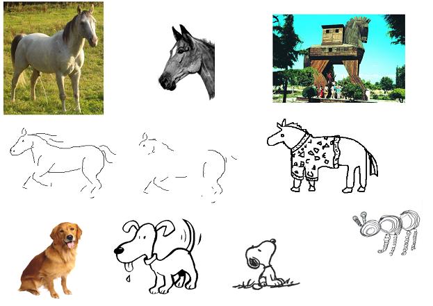 Es geht mit einer ausgesprochen geheimnisvollen Fähigkeit unseres Gehirns, ohne die Sprache nicht machbar ist. Es nennt sich Abstraktion. Wir fassen, ohne darüber nachzudenken, Erscheinungen zusammen und bilden einen Oberbegriff. Die Eigenschaften dieser gemeinsamen Objekte erfassen wir intuitiv. Erst im Nachhinein könnte man mit komplizierten sprachlichen Umwegen die Kriterien exakt definieren. Man würde aber bald merken, dass das gar nicht einfach ist und es vollständig zu machen, ist fast unmöglich. Unser Gehirn braucht das aber gar nicht. Wir 'wissen von selbst' nach einigen Jahren der Erfahrung, was ein 'Pferd' oder ein 'Hund' ist.