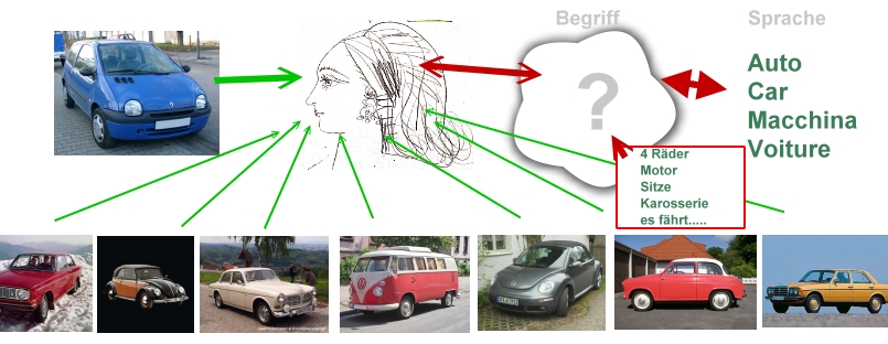 Ist ihnen dabei klar, dass es das, was dieser Begriff aussagt, gar nicht gibt in der realen Welt? Es gibt kein 'Auto'. Aber es gibt Objekte in dieser Schublade Auto, nämlich ganz bestimmte 'Autos'. Die Fachleute sagen das genauer: es gibt 'Instanzen' des Begriffs 'Auto'.