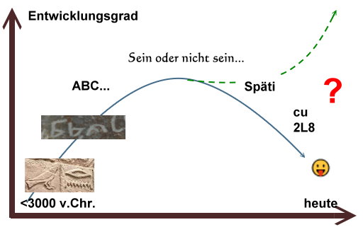 So hat sich die heutige Sprache entwickelt mit ihren Höhepunkten bei Shakespeare oder Goethe. Wie es damit weiter geht, steht in den Sternen. Aber entwickeln wird sie sich, unaufhaltsam. So ist unser Gehirn nun mal.