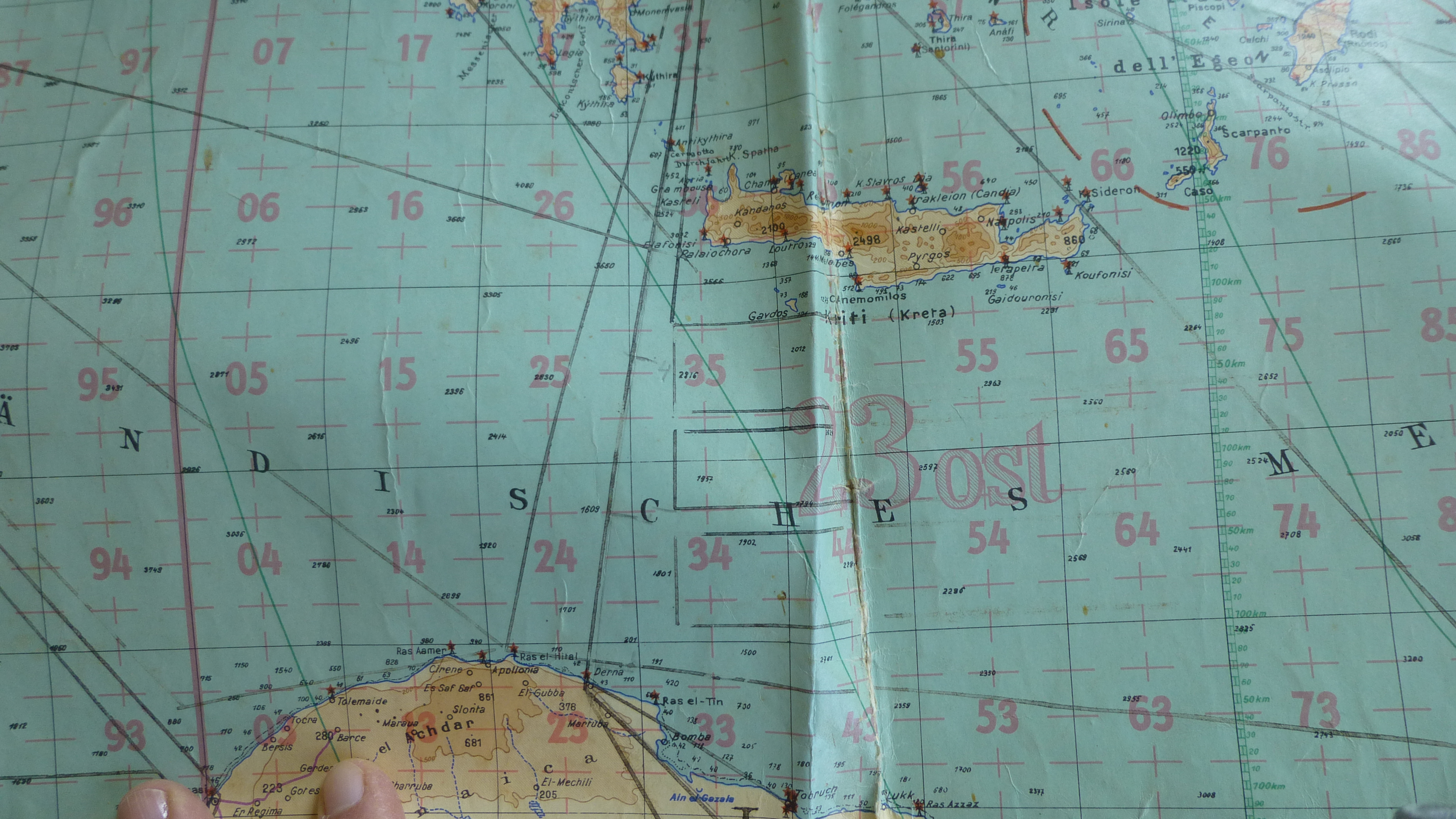 Die Originalkarte mit dem Eintrag des Abschusses. Beim Zeichen Kreis 'O' erfolgte der Angriff,