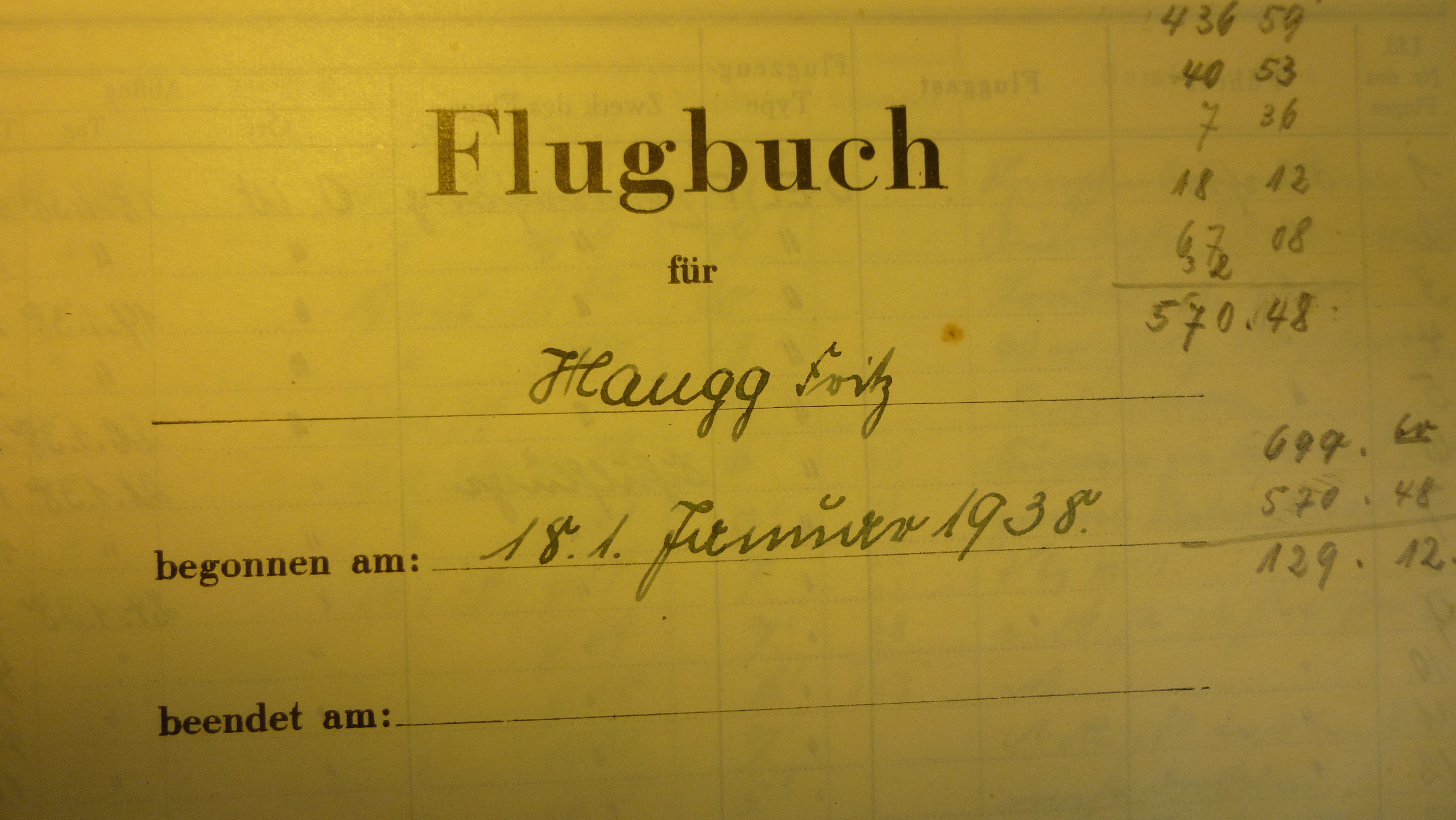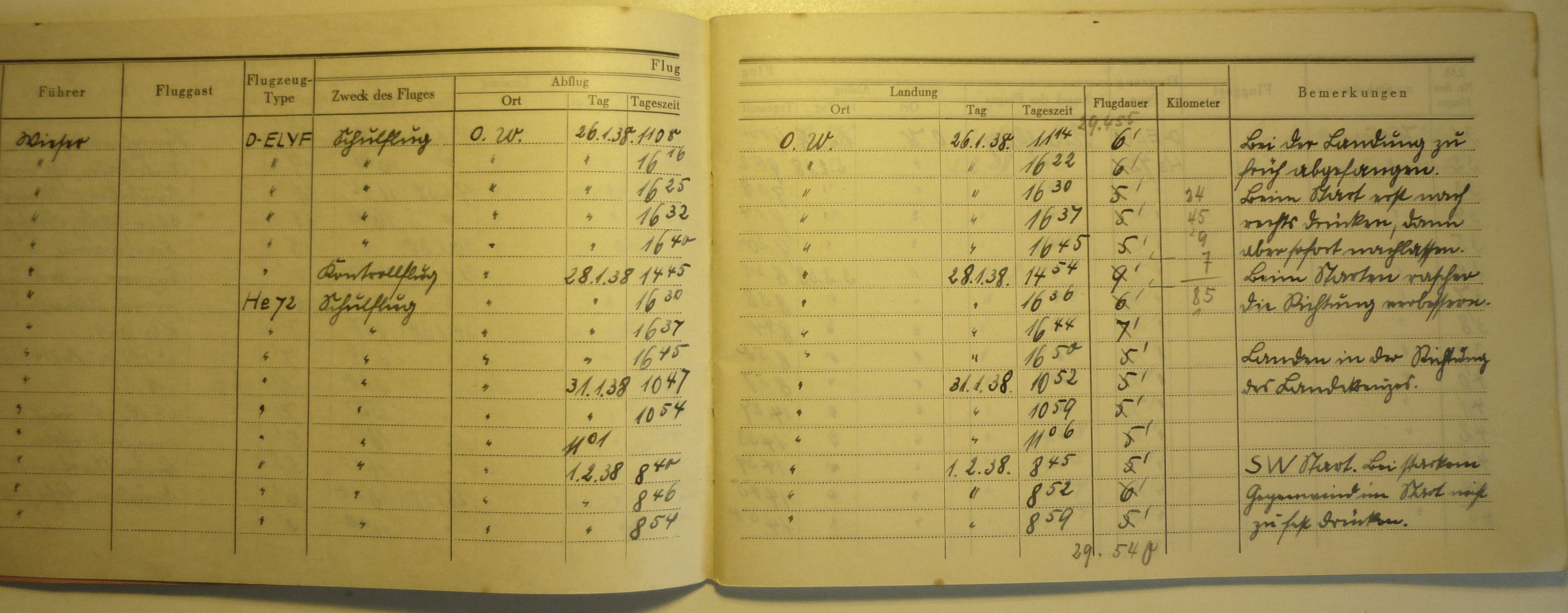 Eine der ersten Seiten des Flugbuchs von 1938, Übungsflüge mit FW44 Stieglitz und Heinkel HE72 und Bemerkungen des Fluglehrers.