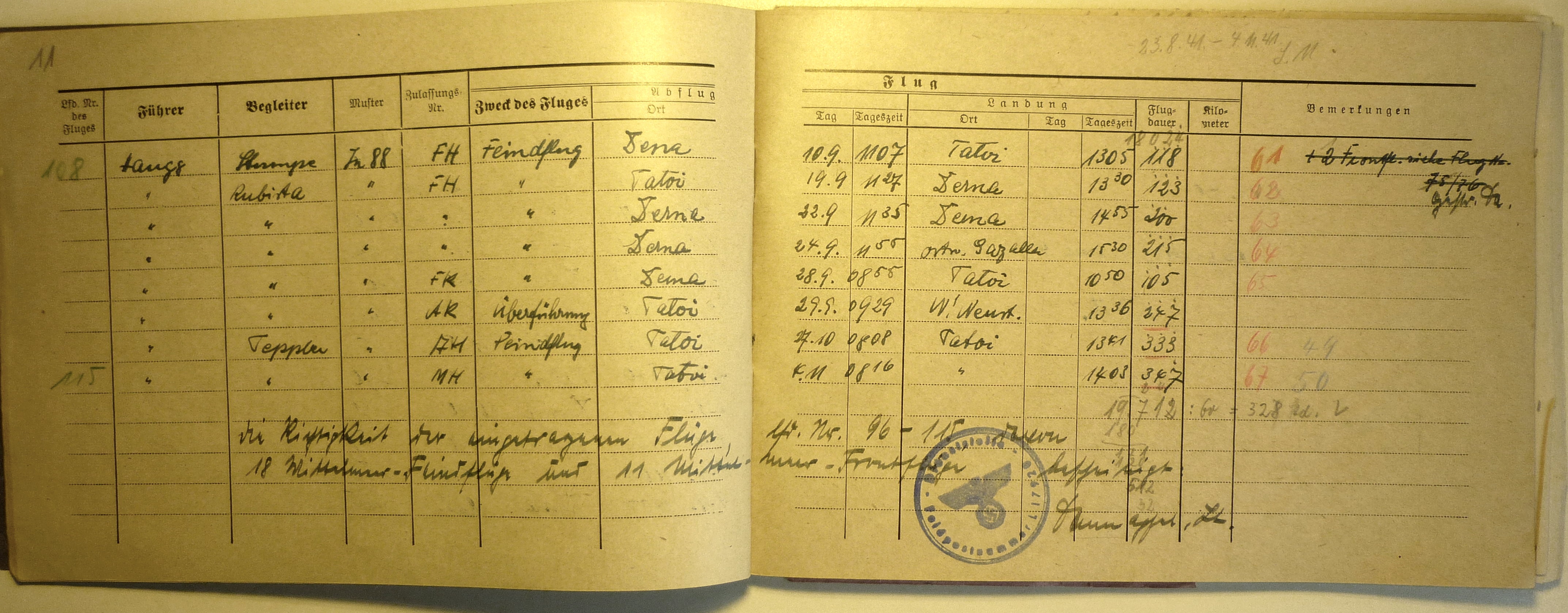 Flugbuch mit dem Eintrag vom Abschuss am 24.09.41. Der Absturz wude nicht besonders vermerkt.